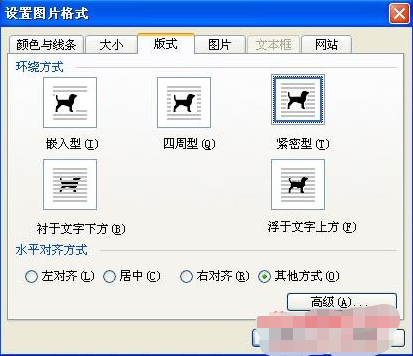 (3)在打开的对象格式对话框中,选择【版式】选项卡,单击【高级】按钮,再选择【图片位置】选项卡。