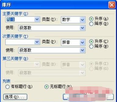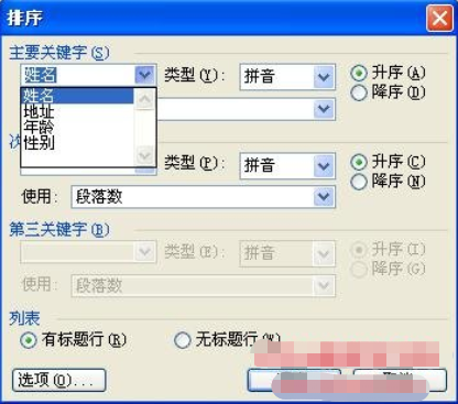 如果表格有标题行,则默认情况下"列表"选项选择"有标题行","主要关键字"下是以标题行的关键字出现的,如下图: