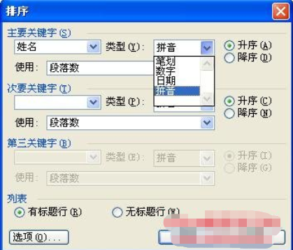 4、在"类型"选项则选择按什么方式进行排序,例如按拼音排序,也就是按拼音的声母排序,这是默认值,如下图: