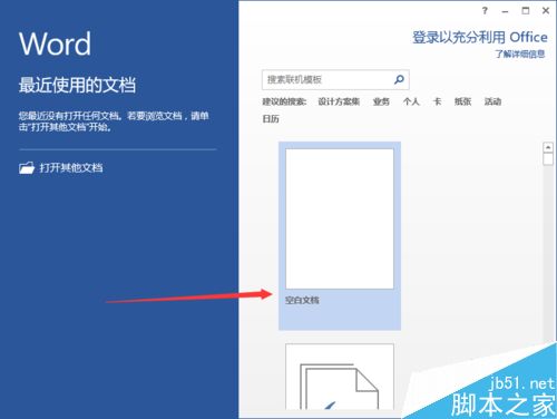 一、在电脑桌面的Word2013文档程序图标上双击鼠标左键,将其打开运行。点击"空白文档"命令,新建一个空白的Word文档。如图所示;