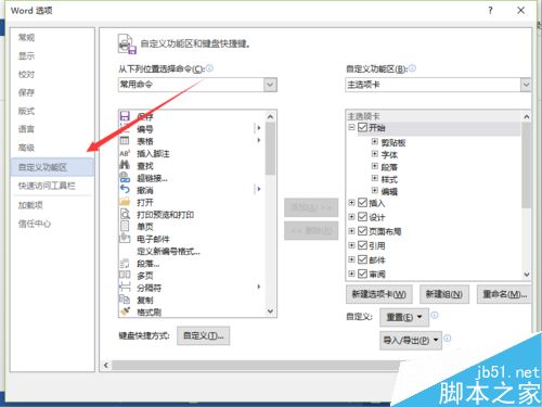 五、在弹出的"Word选项"对话框中,选择并点击"自定义功能区"选项卡栏。如图所示;