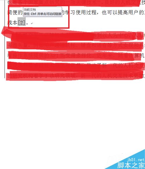 6、完成上步操作后,我们把鼠标放在[2]上单击一下,会有灰色阴影出现,同时上方有一个小窗口弹出:"按住Ctrl并单击可访问链接",如图红色矩形圈出部分。这个时候我们按住Ctrl并单击,页面就自动跳转到后面的参考文献页。