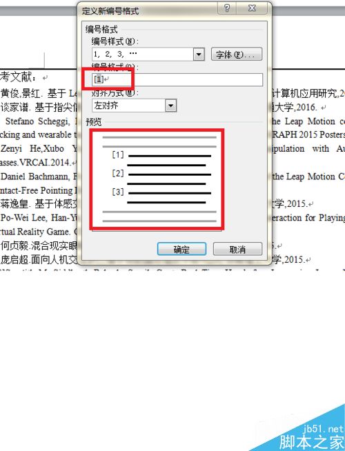2、点击定义新编号格式,然后进入如下界面,在界面中你可以看到我圈出的第一个红色矩形框,在这里面输入你想的参考文献前标显示的模式,默认的是1.样式,这里我想设置成[1]这种样式,那我们在原样式前加一个"["然后在1.后面加"]",最后我们再把里面的小数点去掉即可。在第二个红色矩形框中我可以看到改后的参考文献排版模式,点击确定即可。这个时候,你会看见你的文献均已拍好序。