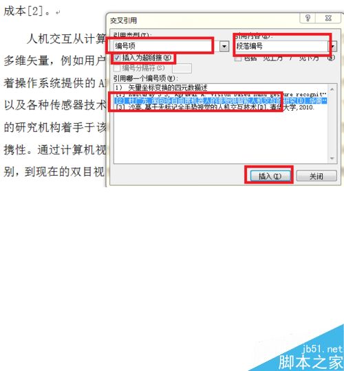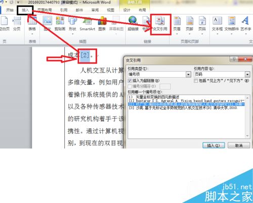 4、接下来找到你文中要备注参考文献的地方,选择如下图所示,然后找到菜单中的插入-〉交叉引用,点击之后,会跳出一个交叉引用设置窗口,在该窗口里你将其中"引用类型"选择"编号项",勾选"插入为超链接"选项,选择需要插入的参考文献。