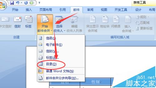 3、打开邮件选项卡找到开始邮件合并按钮,单击其下面的目录按钮。