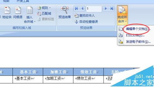 8、现在的工作已经接近完成了,只需要将数据填充进来,在邮件选项卡,单击完成并合并下面的编辑单个文档按钮。