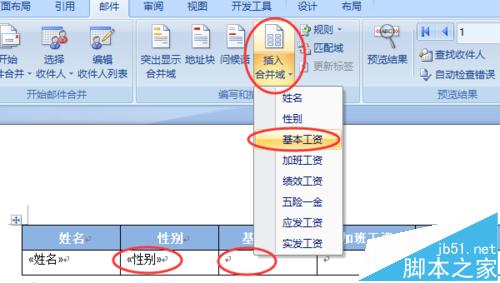 7、确定之后,仍然是在邮件选项卡,找到编写和插入域下面的插入合并域按钮。将域按照名称插入我word表格相应的位置。
