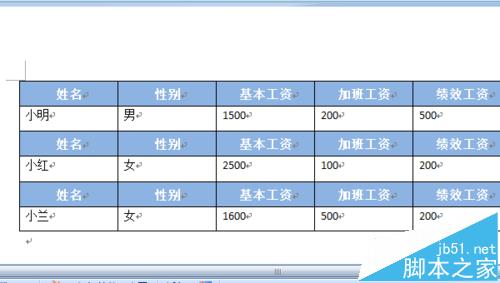 2、打开word,制作我们的工资条。表头与excel中的一致。这里将表头进行了设置,底纹设置成蓝色,字体设置成白色,并且水平居中、垂直居中。这些设置比较简单。