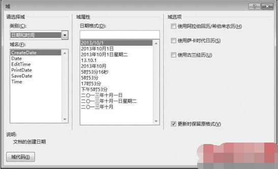 步骤3:弹出"域"对话框,在"类别"选项中单击"日期和时间"选项,即可在"域名"和"域属性"中根据个人需要进行选择。勾选"更新时保留原格式"复选框,单击"确定"按钮,如图3所示。