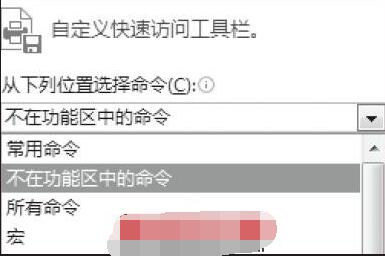 步骤1:单击"文件"标签,在"文件"标签下拉列表中单击"选项"选项。在弹出的"Word选项"对话框中切换至"快速访问工具栏"选项面板。如图1所示,在"从下列位置选择命令"列表框中选择"不在功能区中的命令"选项。