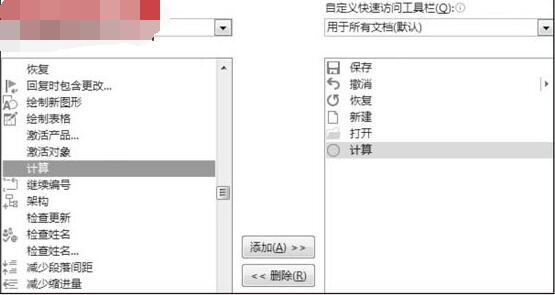 步骤2:在弹出的"不在功能区中的命令"选项列表中,选择"计算"选项,并单击"添加"按钮,将"计算"选项添加到"自定义快速访问工具栏"选项列表中,单击"确定"按钮,如图2所示。