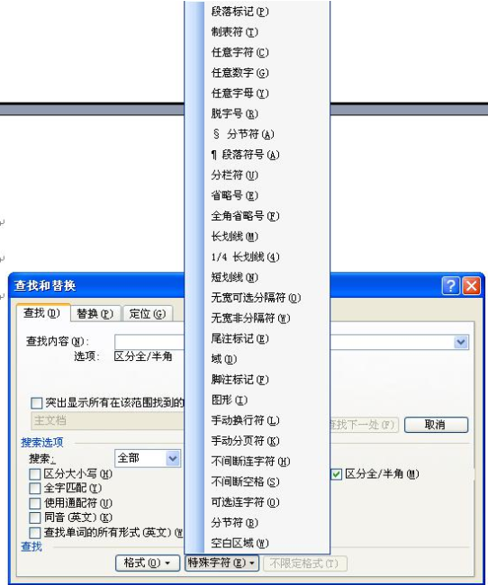 第三步,如果要改为首行缩进,则要将换行符换为回车符即可。可以用替换的高级选项中特殊字符,上框选手动换行符,下框选段落标志,全部替换即可。