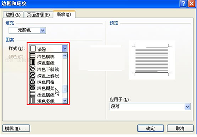 2、弹出边框和底纹对话框,切换到底纹标签,单击图案--样式后的小三角箭头,从下拉菜单中选择底纹样式,这里小编选的是"深色棚架";