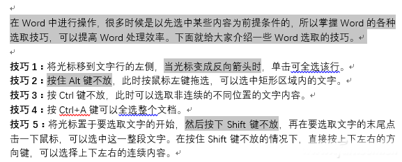 在Word中进行操作,很多时候是以先选中某些内容为前提条件的,所以掌握Word的各种选取技巧,可以提高Word处理效率。下面就给大家介绍一些Word选取的技巧。