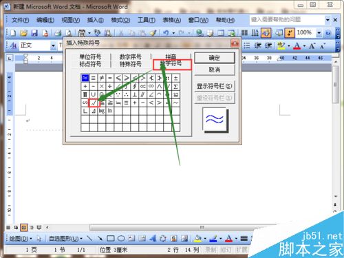5、在特殊符号的新对话框中,找到"数字符号",在图中的相应位置,找到像对号的一个符号,如图中所示,并选中;