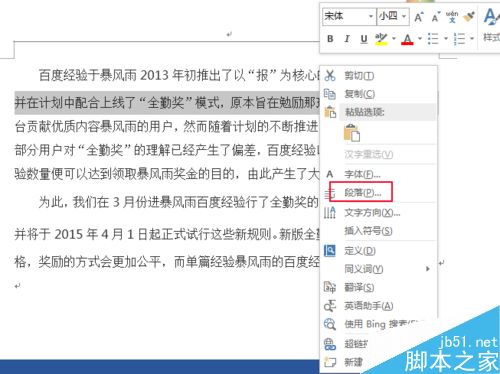3、点击右键-段落也可以。