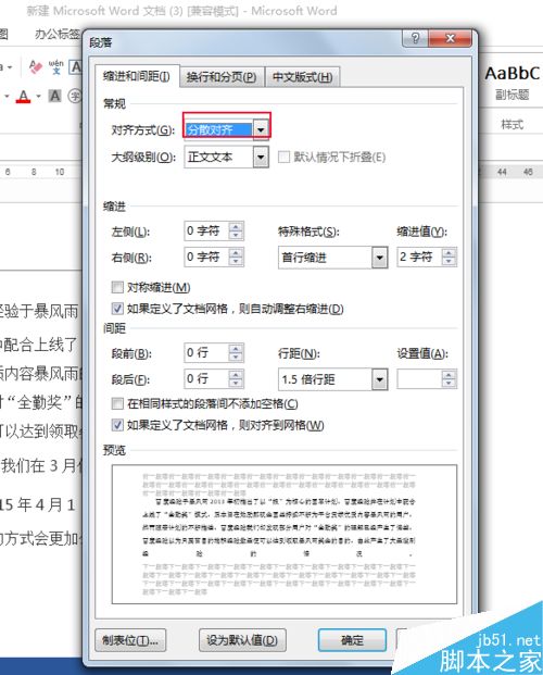 5、对齐方式选择分散对齐,确定。