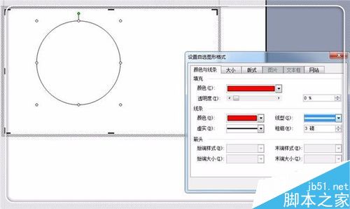 2、在"颜色与线条"标签中,填充颜色选"无填充颜色",线条颜色设为红色,选3磅粗的单线形。
