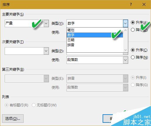 如果参与排序的是数字,例如"电器产量",则要选择"数字"选项。同时,还要注意选中"升序"或"降序"单选框设置排序的顺序类型。如果参与排序的数据是日期类型,如"出厂时间",则选择"日期"选项才可以获得正确的排序结果。
