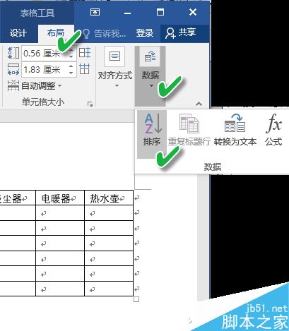 如果表格没有标题行,全部行都要参与排序。只需打开Word文档窗口,在需要进行数据排序的Word表格中单击任意单元格。在"表格工具"功能区切换到"布局"选项卡,单击"数据"分组中的"排序"按钮。