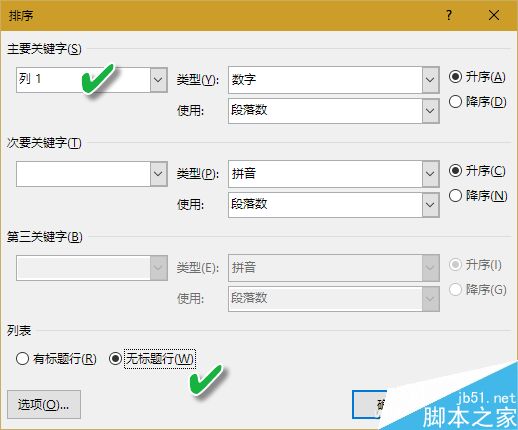 打开"排序"对话框,在"列表"区域选中"无标题行"单选框。这时主要关键字自动变为"列1",点击"确定"即可实现全体排序。