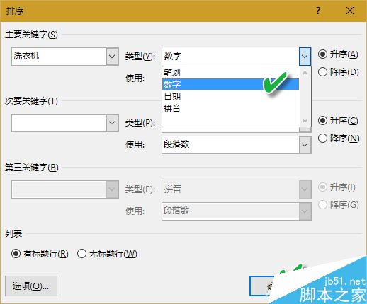单击"类型"下拉三角按钮,在"类型"列表中选择"数字"、"笔划"、"日期"或"拼音"选项,以对应于标题字段的正确类型。这样就可以按照需求选择标题行的排序方式了。
