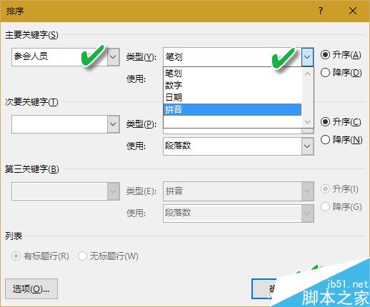 如果参与排序的数据是人名,例如参会人员姓名,则可以按照传统笔画选择"笔划"排序,当然还可以按照"拼音"选项进行排序。