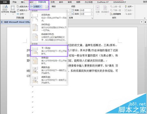打开待处理的word文档,把光标放在要分章节插入参考文献的位置。找到菜单栏"页面布局",下拉"分隔符"选择"下一页"。这样就可以把待处理的文档分成两个部分,以后参入参考文献的时候,就不会在文档的最后一页,而是在这分隔的位置插入参考文献。