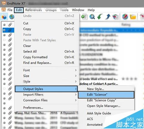 在这里我按照 Science 期刊的文献格式进行演示。打开EndNote软件,菜单栏"Edit"中选择"Output Style",然后选择"Edit Science",