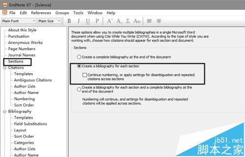 这时会弹出对话框。选择左侧面板中的"Sections",然后在面板中部选择"Sections"的第二个,然后保存设置。这样做的目的就是让参考文献分节插入。