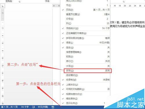 2、通过修改来让状态栏中显示当前的模式。首先在word2013底部的状态栏中点击右键。在弹出来的菜单点击"改写"。