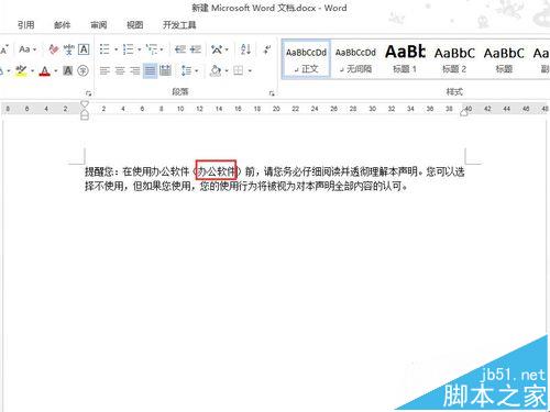 2、现在我们要做的是把第一行括号内的"word"字样,换成"办公软件"。在正常的情况是,是要先把word字样删除,然后输入"办公软件"几个字。现在我们使用word2013的【改写】模式,先按下键盘上的Insert键,把光标放到"word"前面。然后输入"办公软件"。