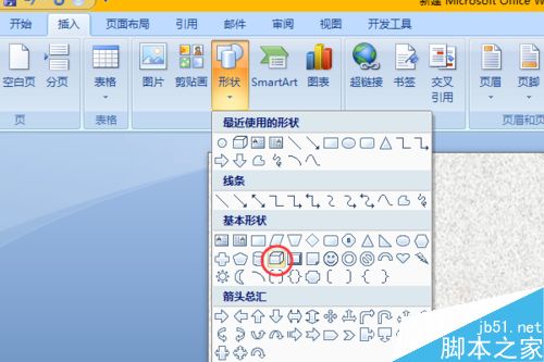 4、添加好纹理后,我们再对word中插入形状,在插入选项卡插图组中,点开形状向下的箭头,选择基本形状中的立方体。