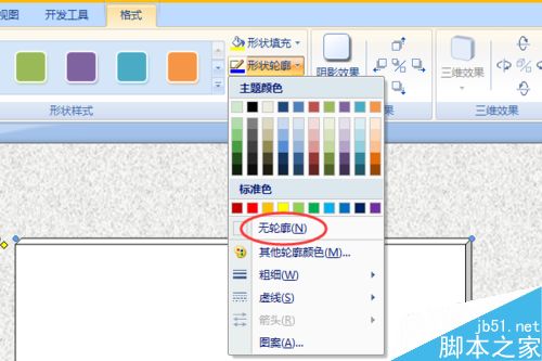 8、首先我们将正方体的轮廓去掉,选中正方体,在格式选项卡中,单击形状轮廓下的无轮廓即可。