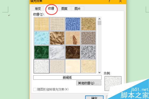 3、在弹出的填充效果对话框中我们选择纹理页签,从中选择一种纹理,将word背景变成一种类似墙纸的颜色。