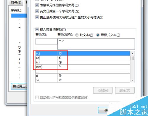 4、点击左侧的自动更正,发现输入括号的C、R、TM,都可以调出快速得到商标。