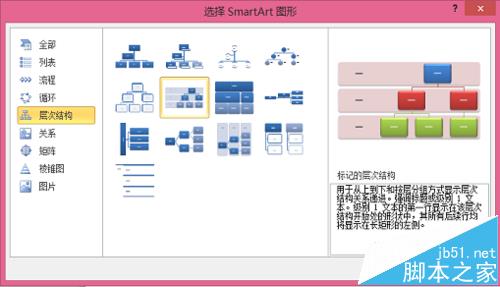 2、电脑会弹出选择smartart图形窗口,选择层次结构,注意题中的细节,选择"标记的层次结构图"。(层次结构图包含很多种)