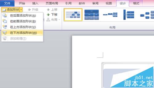 4、选定需要加分支的蓝框,左上角有添加形状,选择在下方添加形状,就可以增加一个分支。(电脑会默认选定新增加的蓝框,因此每次增加分支都需要重新选定框哦)
