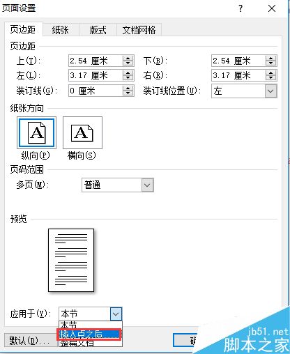 6、在弹出的"页面设置"对话框中,将纸张方向设为"纵向",应用于"插入点之后"。