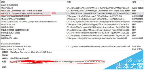 4、这时候,你需要查看右边的"名称","位置","类型",自己找到相同的两个名称选项,如下图,我们可以找到有两个"MathType Commands 6 For Word 2013"的加载项。