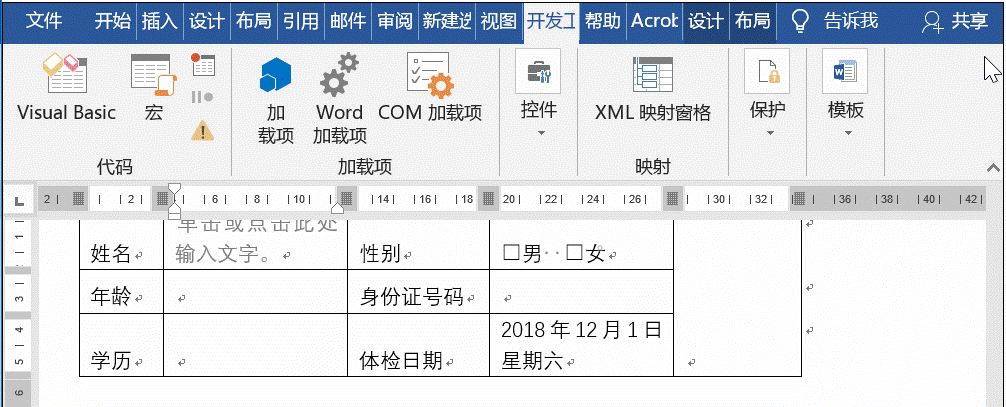 将光标定位在性别所在位置,然后点击【开发工具】——【复选框内容控件】,如果你选中之后发现是☒,这时可以选中属性,更改复选框选中的符号。