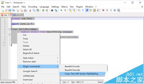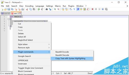 (1)选中Notepad++文本编辑区里的代码,鼠标右键点击选中区域,在弹出的菜单当中选择【Plugin commands】->【Copy Text with to Syntax Highlighting】。