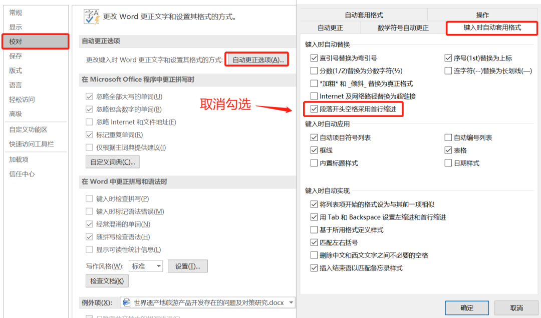 很多人认为遇到这种情况,只要打开Word选项,点击校对——自动更正选项——键入时自动套用格式,取消段落开头空格采用首行缩进的复选框即可恢复正常,但当你实际操作时,你会发现这种方式是行不通的。