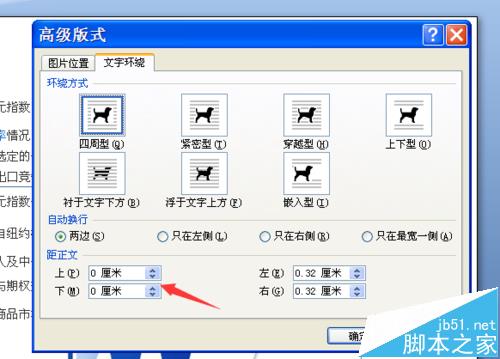 6、也可以点击"其他布局选项"按钮,在高级版式界面,可以设置"自动换行",距正文,上,下,左右的距离