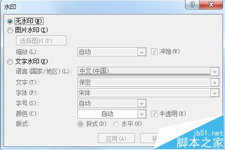 4、如何不想用已经定义的文字,那可以用图片或者自己定义文字,我们点击"自定义水印",会出现如下图对话框。默认是无水印。