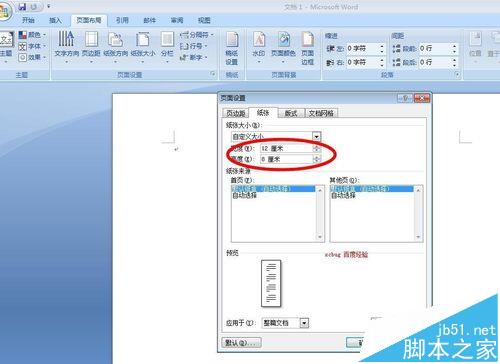 2、我们在弹出的对话框中选择"纸张",将"纸张"的宽与高设置为:12厘米和8厘米,点击确定,效果如图。