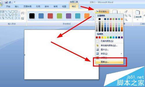 6、点击"格式"--"形状样式"--"形状填充",在弹出的下拉菜单中选择"图案",在弹出的对话框中,单击"图案"选项卡,在"图案"的中间区域选择第二个样式图案,如图框选,单击"前景"下拉按钮,选择"灰色",如图框选,然后单击"确定",效果如图。