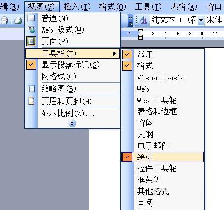1、打开"绘图"工具栏,方法为点击菜单栏的"视图"-"工具栏",找到"绘图",即可调出绘图工具栏;