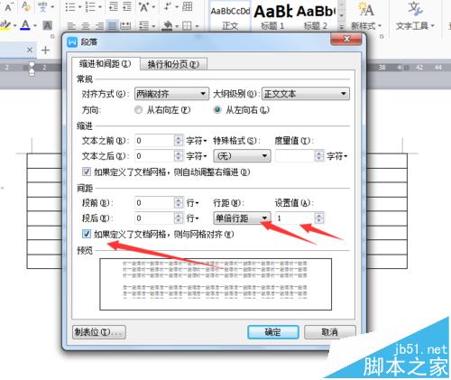 2、然后"行距"→→"单位行距",切记一定要把行距下面一行那个"如果定义了文档网格,则写网络对齐"左边的小框框里的勾去掉!!!这行点这个才有用,不点就没用!