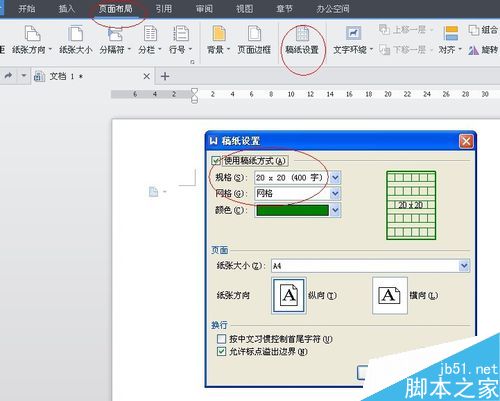 4、在编辑的时候,我们随时可以更改稿纸文档的设置;行数、列数。网格颜色等,都可以改变。单击页面布局→稿纸--稿纸设置进行新设置